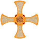 The Consecration Cross, also called a Rounded Cross, takes several forms but they are all cross-shaped geometric patterns. The arms of this version are splayed, known in heraldry as pattee.